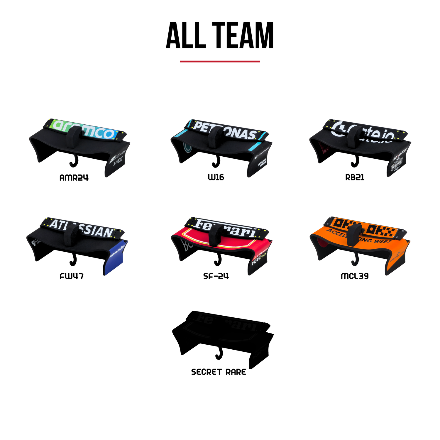 Each DRS Keyhook Blind Box contains 1 random keyhook inspired by your favorite racing teams including AMR24, W15, RB21, FW47, SF-24, and MCL39.